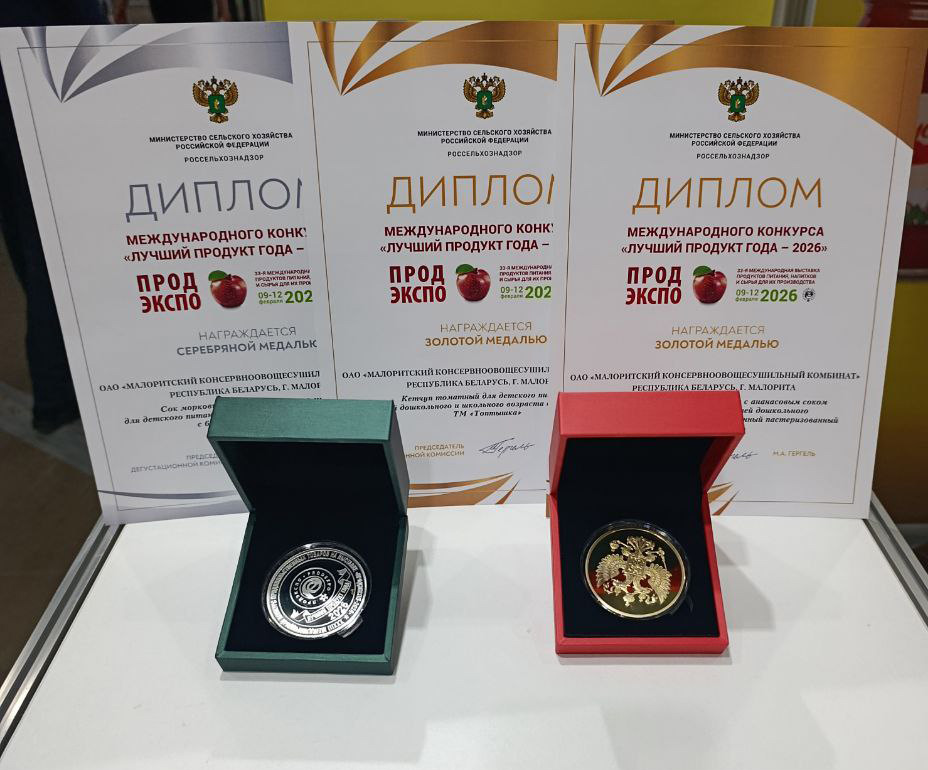Высокое качество выпускаемых продуктов отмечено в международном конкурсе "Лучший продукт года - 2026" в г. Москва в рамках выставки "Продэкспо - 2026".